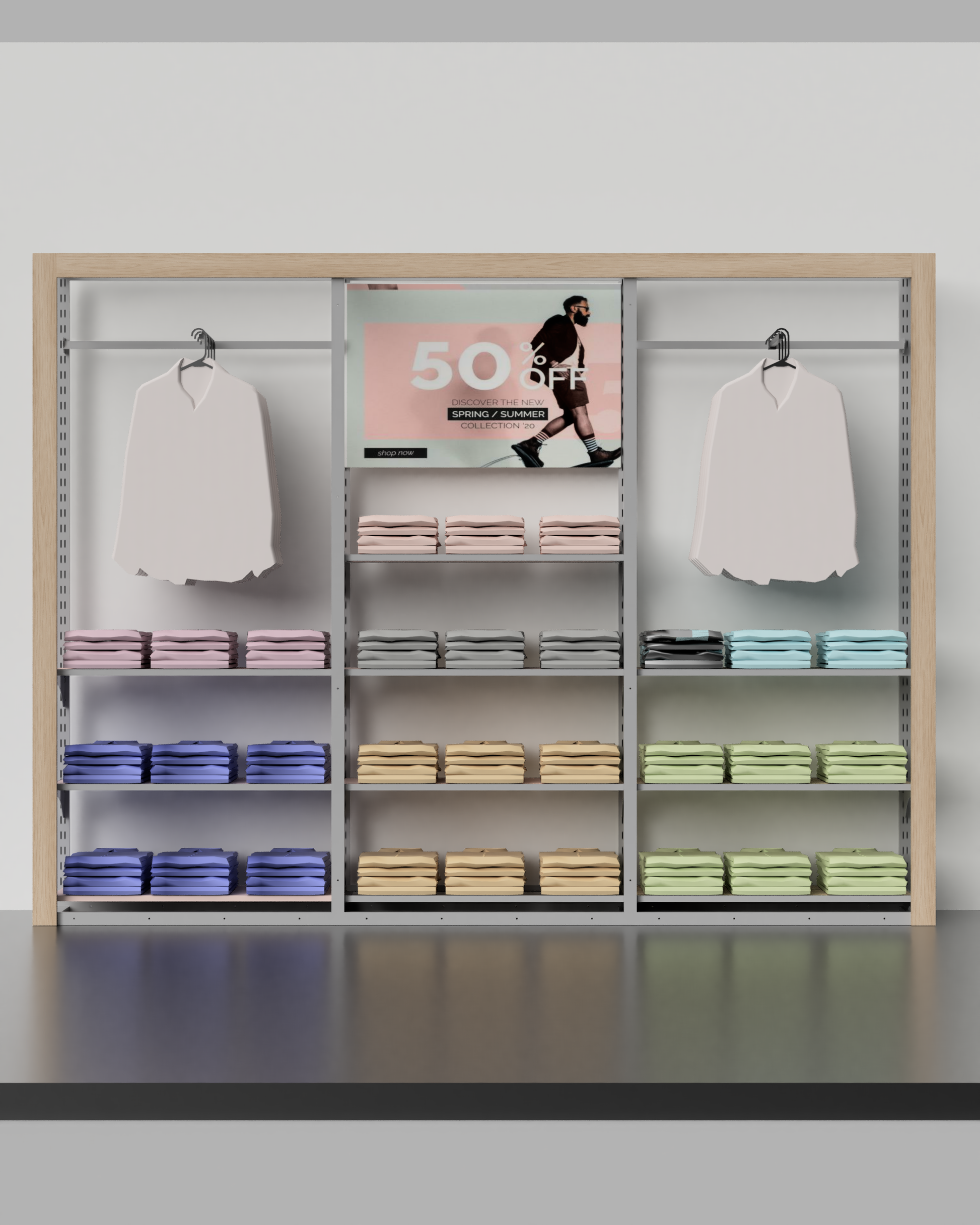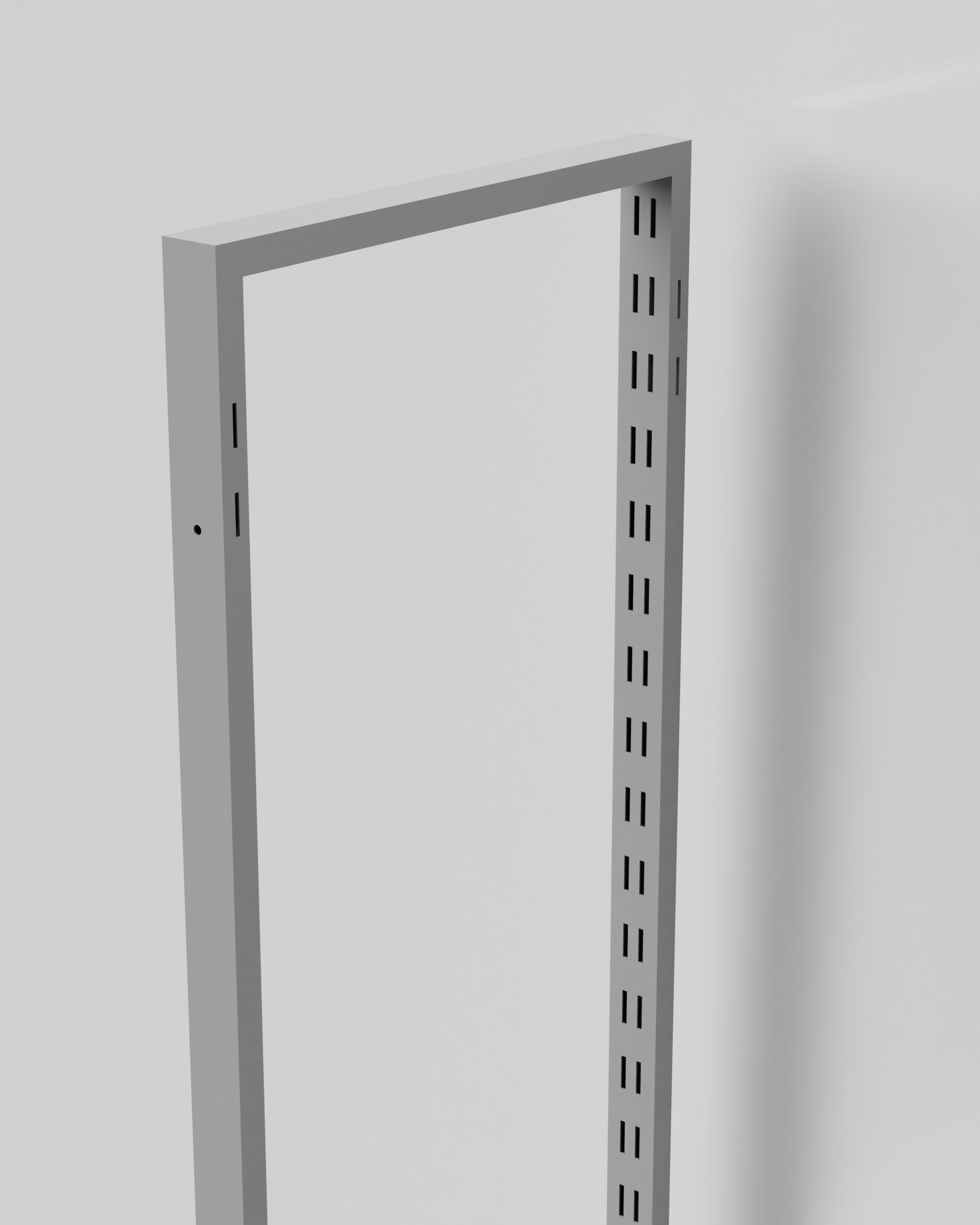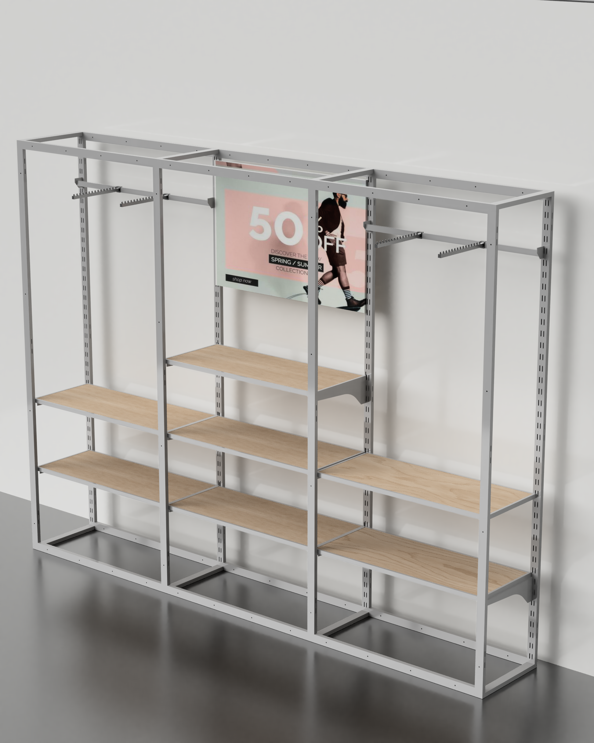 TOKYO MESH FRAME ™ is a modular wall-mounted display system built for retail spaces. Its sleek structure with slots on the back pipe allows flexible attachment of shelves, hang rails, and accessories — ideal for fashion, footwear, and lifestyle stores. (40x25mm REC pipe)