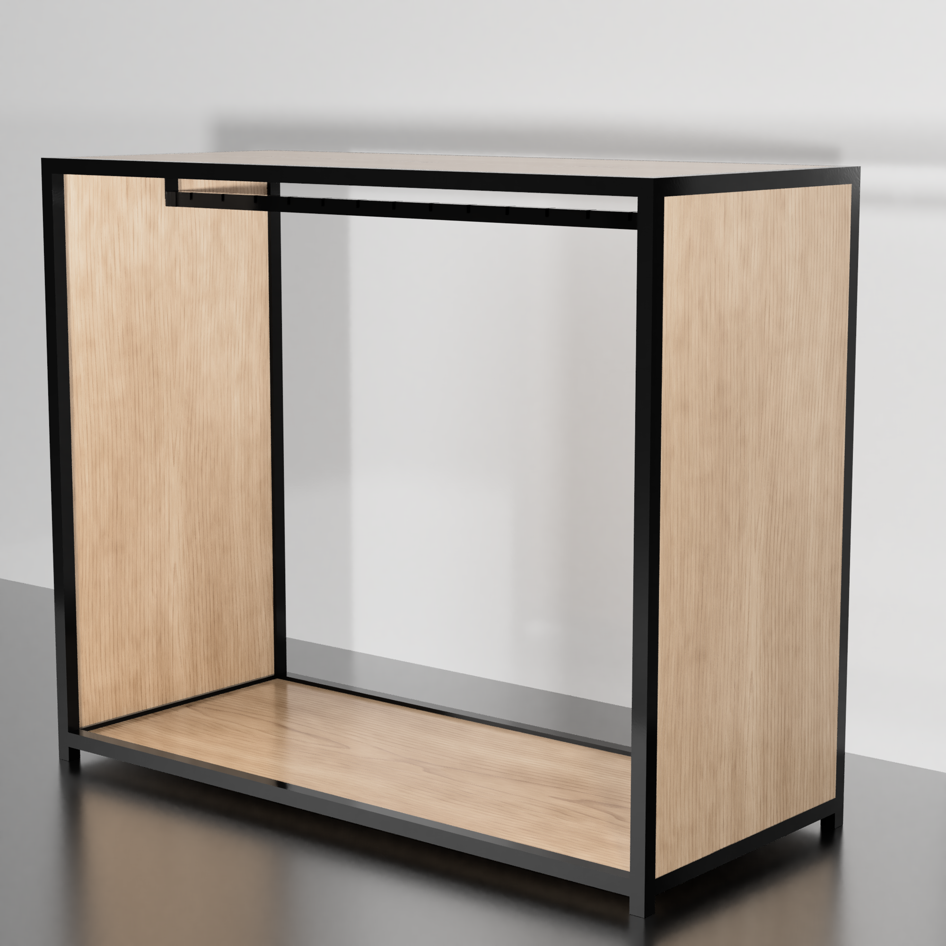 Elevate your retail display with the Zenith Garment Hanging Counter. Designed for both style and functionality, this modern unit is ideal for showcasing apparel in a clean and organized way. The open-frame design with a built-in hanging rod allows for easy access and visibility, while the sleek black metal frame paired with warm maple panels adds a sophisticated touch to any store environment.